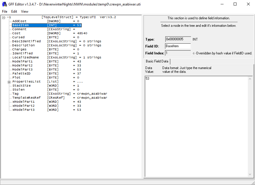 And then you can manually edit the values you want. For item, the only thing that toolset won't let you change is baseitem type. I use this a lot to make a copy of existing weapon for NPC and change it from dagger to for example short sword. To do this you need to change the value of BaseItem field. The vanilla values can be found on NWN Wikipedia. So in my case I would change value 22 (dagger) to 0 (shortsword). Then I should open the item in toolset again and select new appearance parts for it. I should also make sure that creature has required weapon proficiency to equip the weapon type (which can not be the case if it was dagger and we change it to kukri). If creature missing the required weapon proficiency, it won't use the weapon.